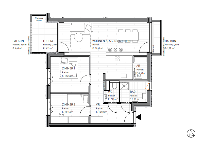 Die Möblierungen in den Grundrissen dienen als Orientierungshilfe und sind nicht im Kaufpreis inkludiert.