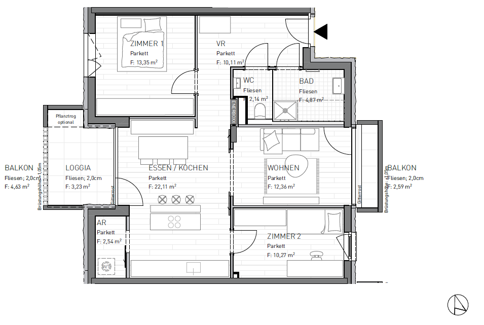 Bei dieser 3 – Zimmer Wohnung wurde jeder Quadratmeter optimal genutzt. Nach dem Eintritt in die Wohnung finden Sie den getrennten Sanitärbereich zu Ihrer Linken. Durch den geräumigen Vorraum gelangen Sie zum 22,11m2 großen Koch- und Essbereich mit direktem Zugang zum ersten Balkon. Weiters finden Sie hier einen Abstellraum. Der 12,36m2 große Wohnbereich hat einen Zugang zum zweiten Balkon, dieser schafft zusätzlichen Freiraum. Zwei Schlafzimmer sorgen für den perfekten Rückzugsort zum Entspannen.