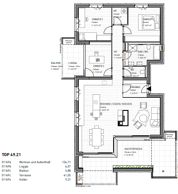 Dieses knapp 125m2 große Penthouse beeindruckt mit einer optimalen Raumaufteilung, die jeden Quadratmeter optimal nutzt. Die großzügige Fläche von über 56m2 umfasst den Wohn und Essbereich, welcher einen geselligen Treffpunkt für die ganze Familie bietet. Hier finden Sie das Highlight der Wohnung, die 41m2 große, südlich ausgerichtete Dachterrasse, welche Ihnen den ganzen Tag über viel Licht und Wärme garantiert. Ein Hoher Wohnkomfort wird Ihnen durch die drei geräumigen Schlafzimmer geboten, welche einen optimalen Rückzugsort erschaffen. Aus dem dritten Schlafzimmer hat man den direkten Zugang zum knapp 10m2 großen Balkon.