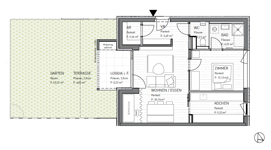Diese hochwertige 2 – Zimmer Wohnung mit herrlicher Terrasse, welche zum knapp 54m2 Garten führt, überzeugt durch Ihre harmonische Raumaufteilung. Beim Eintritt in die Wohnung kommen Sie in den geräumigen Vorraum, welcher noch dazu über einen Abstellraum verfügt. Daraufhin gelangen Sie in den von der Küche abgetrennten Wohnraum, welcher Ihnen einen direkten Zugang zur 3,23m2 Loggia bietet. Das 12,13m2 Schlafzimmer schafft eine idyllische Ruhe Oase mit einem direkten Zugang zum Badezimmer. Das WC ist vom Bad getrennt.